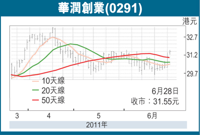 華潤創業(0291)在昨日反覆市下的表現亦見不俗,面對港股中段轉弱,其股價尚能企於全日高位附近,高見31.6元,最後以近高位的31.55元報收,升0.5元或1.61%,成交1.3億元。華創已定位為中國最大的消費品企業,專注於中國的消費品業務,包括零售、啤酒、食品及飲品業務,而基於其來自核心業務的收入理想,因而也贏得市場投資者的認同。