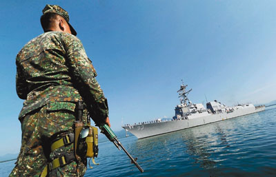 ■美國與菲律賓昨日於蘇祿海展開為期11日的海上聯合軍演。圖為美國導彈驅逐艦鍾雲號駛抵菲律賓普林塞薩港。 法新社