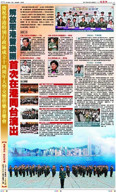為熱烈慶祝香港回歸14周年,由中國人民解放軍軍樂團、香港警察樂隊、駐香港部隊軍樂隊和香港合唱團協會首次聯合演出的大型交響管樂音樂會——「慶祝香港特別行政區成立十四周年大型交響管樂音樂會」,由香港特別行政區政府主辦,民政事務局承辦,康樂及文化事務署統籌,今次合唱協會有百多位團員參與;再加上駐香港部隊軍樂隊,軍、警、民同台演出,超過400人的陣容,以美妙樂韻結合儀仗表演及影片,與港人一起回顧香港歷史發展及繁榮景象,實在難得一見。