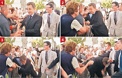 法國總統薩科齊(圖中)昨天在西南部一個城鎮訪問,隔著圍欄與當地居民握手時,突然遭一名站在後排的男子抓住膊頭用力拉扯,並企圖揮拳打向他。薩科齊失去平衡幾乎跌倒,在場保鑣立即衝上前攙扶,抓住施襲男子。報道指,該名32歲男子來自洛特-加龍省,是當地一個劇院職員,此前無犯罪紀錄。報道指,薩科齊遇襲時一面驚訝,但事後立即恢復笑容,繼續與民眾握手。 法新社