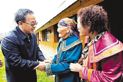 ■內蒙古自治區黨委書記胡春華在根河敖魯古雅鄂溫克民族鄉親切看望89歲的瑪利亞.索老人。