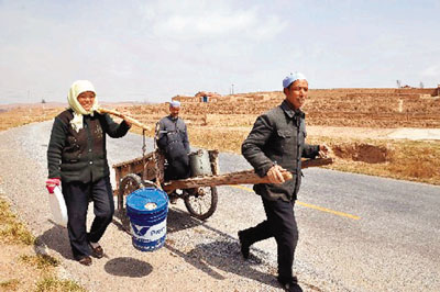 ■中國中西部地區經常缺水,農民需用手拉車到遠處打水。資料圖片