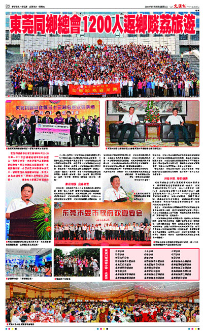 東莞同鄉總會主席王賜豪於6月25-26日率一千二百位鄉親返鄉啖荔旅遊觀光,獲東莞市委、市政府專門設宴熱情歡迎款待。東莞市政協主席劉樹基,市政協副主席、市委統戰部部長鍾淦泉表示,歡迎東莞旅港鄉親常回家,希望大家為家鄉城市、產業升級轉型出謀獻策。