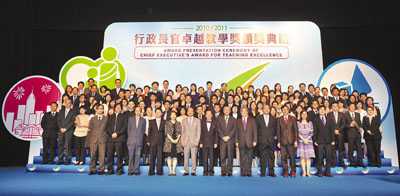 ■曾蔭權與主禮嘉賓,在行政長官卓越教學頒獎禮上與各獲獎教師合照。