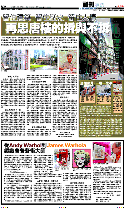 豪宅早已衝出豪宅區,不知不覺在香港各個區域播下種子,扎根成長。同時,不少舊區面臨清拆,以騰出空間,那些盛載上一代記憶的建築物不斷倒下,這是城市之福還是城市之禍﹖三、四十年代,香港的平民百姓大都只能居住在唐樓或由唐樓分間成的板間房,只有洋人才住得起洋房,唐樓可說是港人的集體回憶,面對城市的發展,我們要保經濟棄文化嗎﹖讓我們深思。面對建築物的拆與不拆,我們該用一把怎麼樣的尺子呢? ■文、攝:香港文匯報實習記者 余秋婷