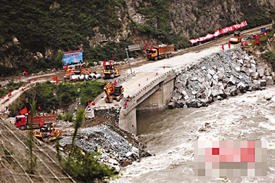 四川路橋北線施工負責人楊大偉介紹說,在加快推進洩洪槽挖掘的同時,左岸的工作也在加快進行。南線6日被洪水沖成「懸橋」的羅圈灣大橋的加固工作已於8日下午完成,北線汶川方向的橋頭四面體已拋到近100米遠的距離。羅圈灣整個全線搶通工作正按照方案有條不紊地進行。