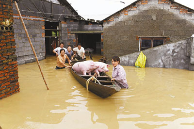 ■內地近年洪旱極端氣候頻發。圖為今年6月浙江村民將家畜裝船從洪水地帶轉移。