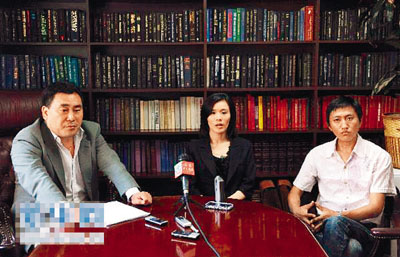 ■11日,桑蘭(中)和她的代理律師海明(左)、經紀人黃健在紐約出席新聞發佈會。網上圖片