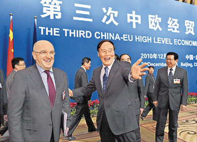■中歐在2008年啟動副總理級的中歐經貿高層對話。圖為國務院副總理王岐山出席第三次中歐經貿高層對話。 資料圖片