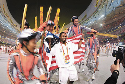 參選奧運會的美國運動員都是從當地大學選拔出來的。圖為美國運動員在京奧閉幕式與表演人員合照留念。 資料圖片