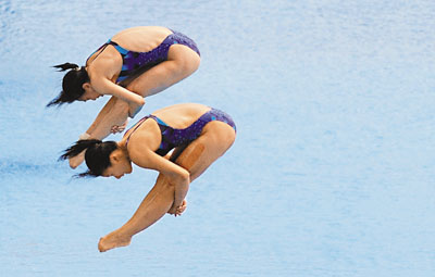 ■吳敏霞/何姿在3米板比賽中。 法新社
