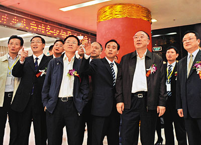 ■重慶藥交所董事長劉高清(右四)向重慶市長黃奇帆(右三)介紹重慶藥品交易所的運行情況