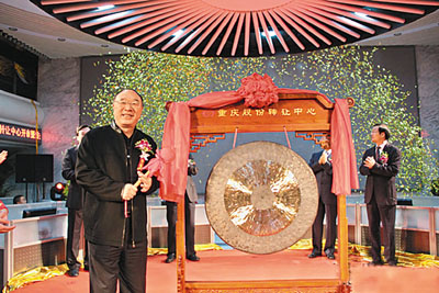 ■重慶市長黃奇帆鳴鼓,慶祝重慶股份轉讓中心開市。
