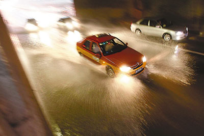 ■汽車行駛在積水的北京街道上。 中新社