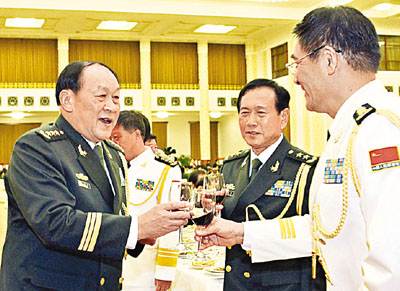 中國國防部昨日在北京人民大會堂舉行盛大招待會,慶祝解放軍建軍84周年。國務委員兼國防部長梁光烈上將向中外來賓致祝酒辭。中新社