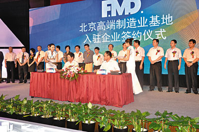 在24日舉行的「智慧.智造——北京高端製造業基地簽約儀式暨品牌推介會」發佈會上,京城機電高端裝備製造工業園區項目、北京長安汽車工程技術研究院項目、國能創新項目、瑞好汽車事業部中國市場奔馳項目、五軸聯動電火花加工技術項目共五個項目與基地正式簽署協議,成為新一批計劃進駐的高端製造業項目,總投資額突破百億元大關。北京市房山區副區長馬繼業介紹,目前,基地在建、簽約和在談項目共54個,建成後總投資688.6億元,產值2550.3億元,創造稅收111.71億元,解決就業9.7萬人。僅據目前情況預計,基地未來有望吸引總投資超過千億的社會資金入駐。