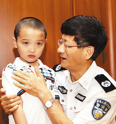 公安部2日在北京舉行偵破「2·21」、「6·8」特大拐賣兒童團夥案座談會。圖為國務委員、公安部部長孟建柱抱起被解救的被拐兒童——7歲的小陽(化名)。 新華社