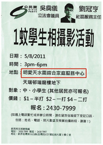 香港文匯報昨日接獲一名市民投訴,指吳靄儀與該黨社區服務主任劉冠亨,昨午在明愛天水圍綜合家庭服務中心舉辦政黨活動,並就該活動在天瑞h屋苑大肆宣傳,質疑「訟棍」有意借社福機構為其選舉宣傳造勢,「最離譜匯係,佢地借宣傳單張(上圖)趁機收集居民電話、住址等個人資料,佢地咪當市民無腦先得飽A律師大晒咩?明愛是受社會福利署資助的社福機構,理應保持政治中立,今日唔管,他們日後在選舉期間都可以助選啦!」
