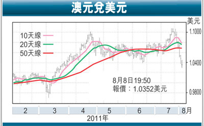 另一方面,澳洲央行在其8月5日公布的貨幣政策報告中,已將今年的平均經濟成長預測從5月時的3.25%顯著下調至僅有2%的增長,這除了是反映澳洲央行於下半年的升息機會已大幅下降之外,該情況亦將令澳元匯價遇到進一步回吐的壓力。此外,市場在憂慮歐債危機仍可能蔓延以及美國主權債信評級又被下降之際,瑞郎以及日圓等主要避險貨幣依然是持續處於偏強走勢,故此連帶澳元兌日圓交叉匯價亦迅速從上周的85水平大幅下跌至本周初的80水平,這亦對澳元匯價形成頗大的下調壓力,預料澳元將反覆跌穿1.0200美元水平。