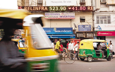 ■印度街頭屏幕顯示昨日股市大跌。 美聯社
