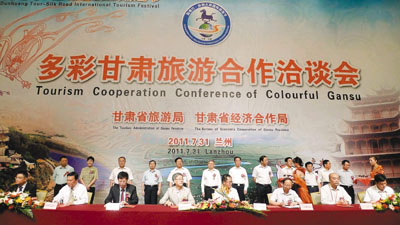 香港文匯報訊(記者 王岳 蘭州報道)剛剛開幕的「敦煌行·絲綢之路國際旅遊節」期間,「多彩甘肅」旅遊合作洽談會成功舉辦,當天的簽約儀式上,共有10個大項目成功簽約,涉合同資金額達31.3億元人民幣。這次洽談會上,甘肅省旅遊局與香港康泰旅行社、香港中國旅行社有限責任公司、澳門中旅集團、台灣中安旅行社、新加坡華運旅行社、廣東廣之旅旅行社、中國金橋旅遊總公司、上海春秋旅行社等8家旅遊企業簽訂了絲綢之路旅遊合作開發戰略協議。