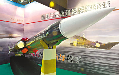 展場的背板上還以2枚「雄風三型」飛彈擊中外型酷似「瓦良格」號的航空母艦,並大書「現代剋星,航母殺手」的標語,「現代」暗指大陸購自俄羅斯的現代級軍艦,令人聯想到10日才下水試航的大陸第一艘航空母艦「瓦良格號」,與對岸隔空較勁的意味十足。