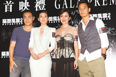 由爾冬陞監製,麥兆輝與莊文強聯合執導,劉青雲、吳彥祖及古天樂主演的《竊聽風雲2》,前晚於尖沙咀舉行首映禮,其中古仔因腳傷未能出席,而凸點的青雲比兩位女主角黃奕和葉璇更有睇頭,大會即場將首映籌得的29萬善款移交聯合國兒童基金會。