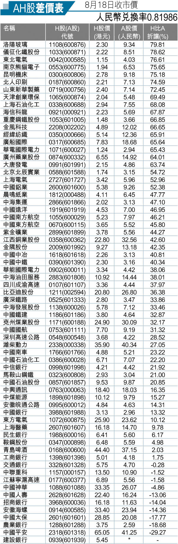 AH股差價表(8月18日收市價)人民幣兌換率0.81986 (圖)