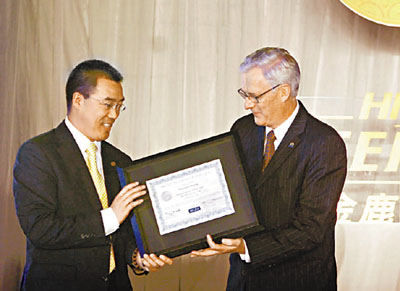 ■ARGUS代表向金鹿公務航空董事長兼執行官劉開宏頒發鉑金五星認證證書。 香港文匯報記者王添翼 攝