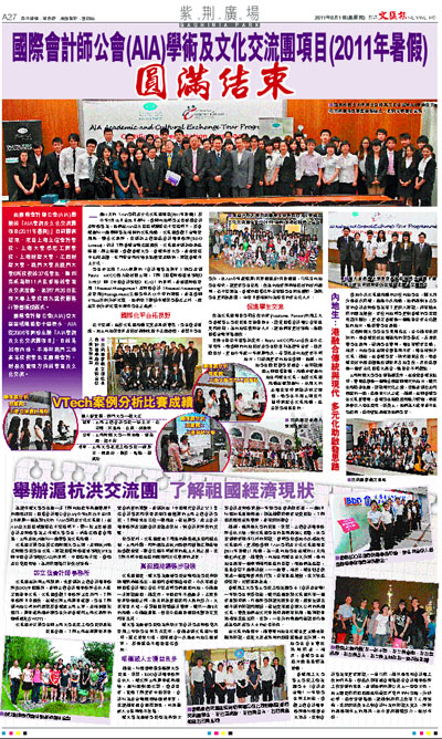 一連11天的「AIA學術及文化交流團項目(2011年暑假)」於今年7月16日至26日舉行,參與內地同學主要修讀會計及財務專業,他們在AIA亞太區區域總監彭子堅陪同下,於香港進行一連串與專業相關的交流活動。交流團參觀了金融管理局、聯合交易所,也到訪立信德豪會計師事務所(BDO Limited),初步了解香港金融系統運作。交流團亦到訪偉易達集團、輝立集團,參觀香港大學、香港科技大學,並遊覽孫中山紀念館、屯門黃金海岸等景點瀏覽及購物,認識香港本土文化。