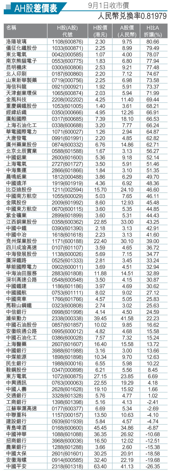 AH股差價表(9月1日收市價)人民幣兌換率0.81979 (圖)