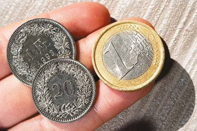 ■瑞郎(左)與歐元(右)硬幣。 路透社