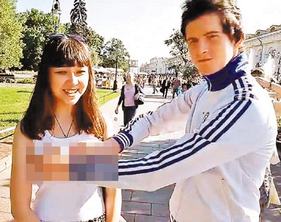 俄羅斯出現了一個頻頻「胸襲」女性的男子,此人「義正辭嚴」地表示,此舉是為了以行動支持總理普京,替普京接觸選民,摸遍1,000位女性的胸部(見圖)。