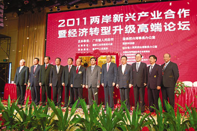 香港文匯報訊(記者 沙飛、余麗齡 惠州報道)9月6日,由廣東省政府和國務院台辦共同主辦的「2011兩岸新興產業合作暨經濟轉型升級高端論壇」在惠州市舉行,來自兩岸的300餘名代表參加了論壇活動。兩岸企業擬攜手轉型升級,並依托新興產業為新的經濟增長點,實現困境突圍。論壇還為粵台石化合作基地、粵台光電合作基地、粵台科技合作與交流(惠州)基地、惠州市台資企業轉型升級聯合服務處舉行了揭牌儀式。