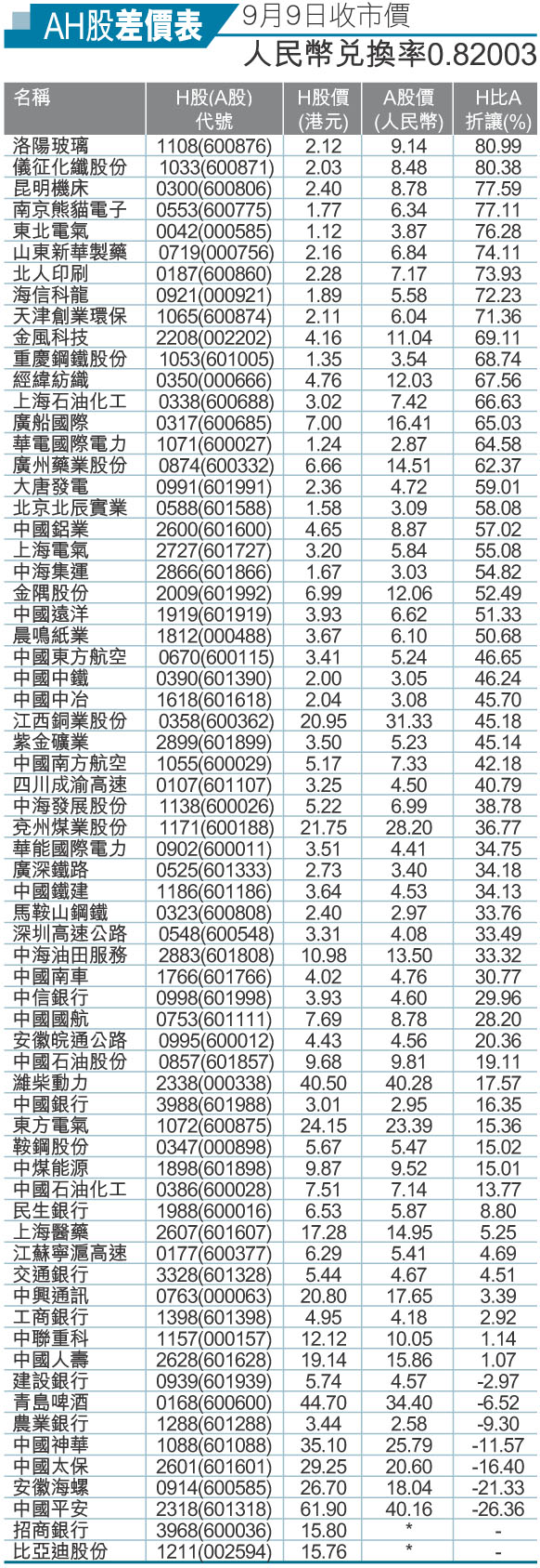 AH股差價表(9月9日收市價)人民幣兌換率0.82003