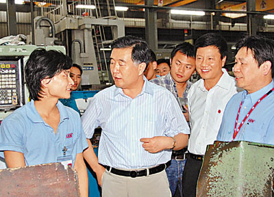 ■中共中央政治局委員、廣東省委書記汪洋(左二)在河源市委書記陳建華(右二)陪同下視察香港龍記集團。