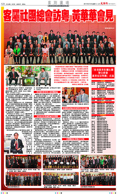香港廣東客屬社團聯合總會(下稱客屬總會)日前組團訪問廣東。訪問團由全國政協委員、客屬總會主席梁亮勝任團長,中聯辦副主任黎桂康、新界鄉議局主席劉皇發任榮譽團長。廣東省委副書記、省長黃華華,省政協主席黃龍雲在廣州親切會見了訪問團成員,黃華華肯定和讚揚客屬總會成立以來的會務工作成效,又對其未來發展提出「三個重要」及「四點希望」的殷切期盼,特別是在推動粵港合作方面,能夠大顯身手、大有作為。 ■香港文匯報記者 沈清麗