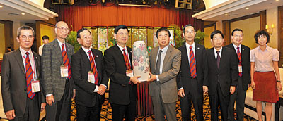 省長致送禮品(左起)劉宇新、何冬青、劉皇發、梁亮勝、黃華華、黎桂康、唐豪、譚耀宗、蔣樂儀。