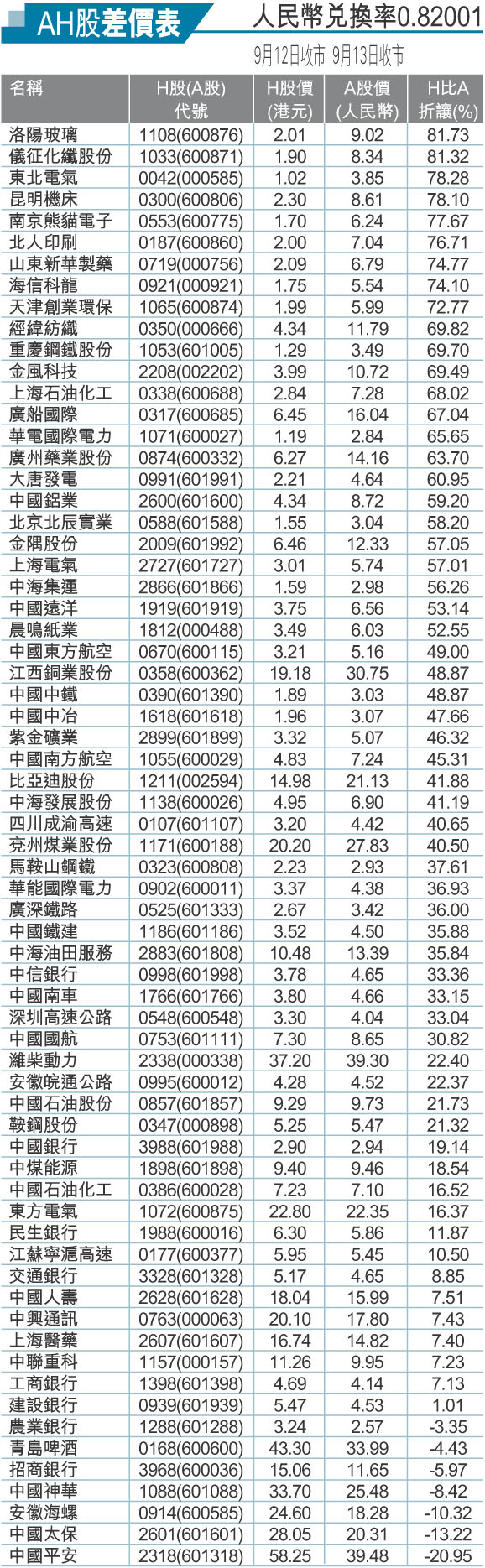 AH股差價表(人民幣兌換率0.81896) (2011-09-13) (圖)