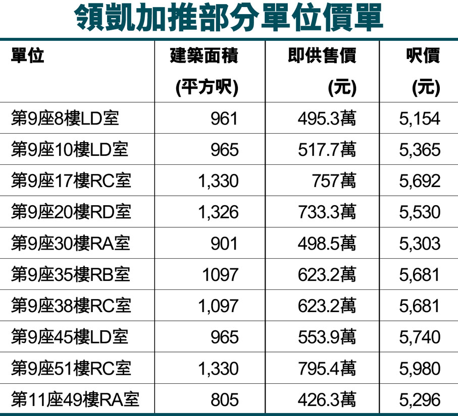 領凱加推部分單位價單 (圖)