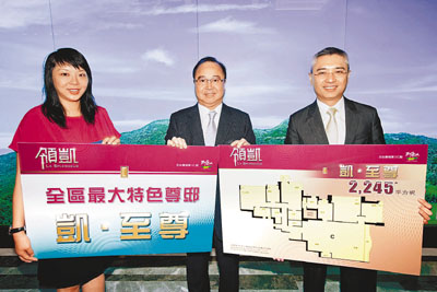 ■長實黃思聰(右)、封海倫(左)及南豐麥一擎(中)介紹領凱第11座66樓LC的特色戶(命名為「凱.至尊」),建築面積2,245呎。