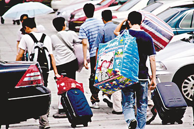 ■剛入學的新生已開始擔心將來就業問題。圖為拖著行裝來校報到的新生。