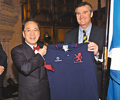 ■曾蔭權訪問蘇格蘭,接受由蘇格蘭前欖球隊教練赫頓贈送的球衣。