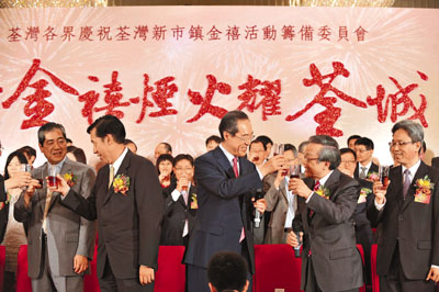 ■署理行政長官唐英年出席「圓玄金禧煙火耀荃城」典禮,與主禮嘉賓祝酒。
