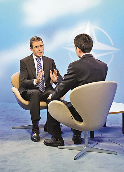 ■北約秘書長拉斯穆森(左)接受新華社記者專訪。 新華社