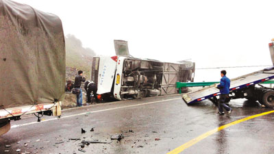 本報記者從阿壩藏族羌族自治州松潘縣宣傳部了解到,發生事故車輛為九寨運業旅遊公司客車,出事時車內包括駕駛員、導遊、遊客共37人,從九寨溝開往黃龍方向。當車輛行駛至雪山梁下行4公里處時出現側翻。事故中6人當場死亡,1人送往醫院搶救無效死亡,另有30人不同程度受傷。