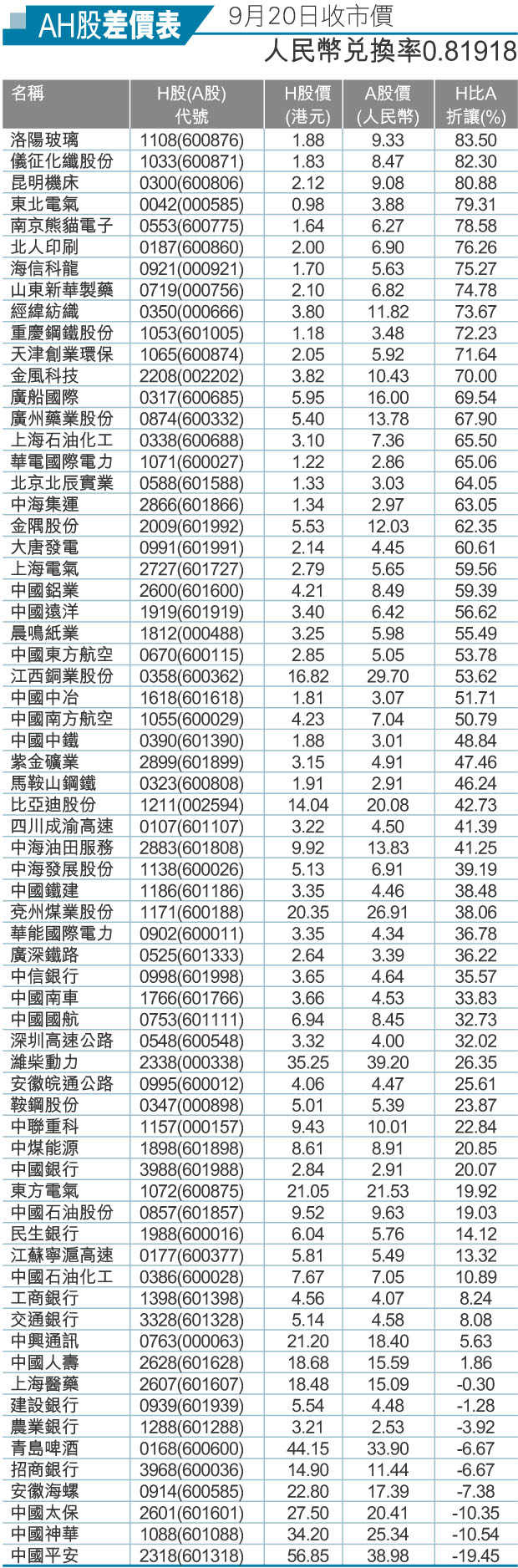 AH股差價表(9月20日收市價)人民幣兌換率0.81918