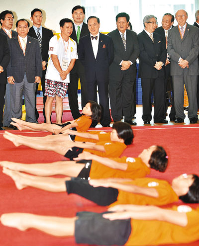 特區行政長官曾蔭權與中聯辦副主任周俊明等,於昨日出席元朗區體育會賽馬會大樓開幕典禮,並參觀體操訓練示範。