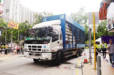事發昨晨9時15分,洪駕駛一輛24噸運菜貨車,沿龍琛路左轉入新成路時,報稱將突衝出橫過馬路的老婦撞倒並捲入車底。現場消息稱,老婦被貨車輾過壓在左頭輪下,當場肚破腸流,左小腿更折斷脫落,場面恐怖,司機立即報警。有途人見狀奔入附近龍琛路一間醫務所求助。