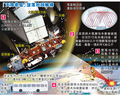 香港文匯報訊(記者 文森)科幻電影中衛星撞地球的橋段今天在現實世界裡上演,或波及香港。美國一枚已廢棄的「高層大氣研究衛星」(UARS)將會墜落地球,美國太空總署(NASA)預計該枚重6.5噸、體積儼如巴士般大的衛星,最快於香港時間今天清晨,最遲下午以時速2.9萬公里進入大氣層。太空總署估計,衛星殘骸墜落地點會介乎南北緯57度之間,覆蓋大部分人口居住的地區,包括香港,但擊中人類的機會為70億分之1。香港天文台指出,至今未有進一步資料,但會密切關注事態發展。有專家指出,碎片落在香港的機會甚低。